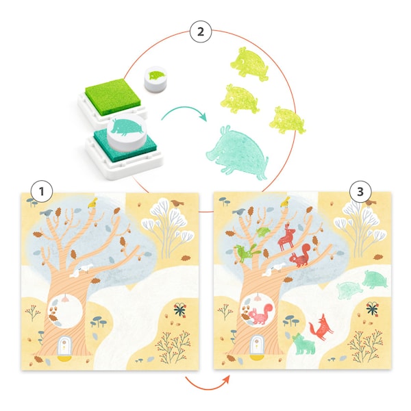 Hauska askartelu, jossa lapsi leimaa villieläinten teemoja täyttääkseen kuvitetut kortit niin, että ne melkein heräävät eloon. Vaihe vaiheelta kortit täytetään kolmella eri värisellä eläimillä, lapsen antaessa mielikuvituksensa lentää ja erilaiset pesät ja kodit saavat asukkaansa. Legal manufacturer Name: Djeco Legal manufacturer Adress: 158 Rue des Grande Augustins, 75006 Paris, Frankrike Legal manufacturer website: https://www.djeco.com/ Legal manufacturer e-mail: info@djeco.com