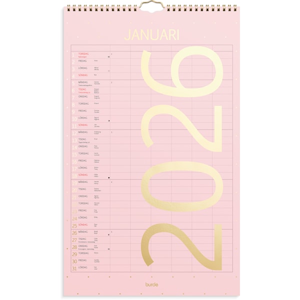 Familjekalender 2026 från Burde. Frisören, tandläkaren, utvecklingssamtal? Ta kontroll över familjens aktiviteter med en familjekalender. Låt barnen fylla i sin egen kolumn och häng almanackan där alla ser den. På så sätt blir hela familjen delaktig i varandras planer och ni kan påminna varandra om vad som är på gång. Kalendern har sex kolumner och är designad i vackra pastellfärger med lyxig guldfoliering, vilket gör den till en självklar mittpunkt hos varje familj! Format: 250×410 mm. Layout: Månad/blad. Kalendarium: 2026-01-01 – 2026-12-31. Spiralbunden. Innehåll: Flaggdagar, helgdagar/aftnar, månfaser, namnsdagar, temadagar/händelser, årsöversikt/årsöversikter, 6 kolumner. Antal sidor: 12. Miljöinformation: FSC®. Legal manufacturer Name: Burde Publishing AB Legal manufacturer Adress: Box 3101, SE-350 43 VÄXJÖ Legal manufacturer website: www.burde.com Legal manufacturer e-mail: info@burde.com