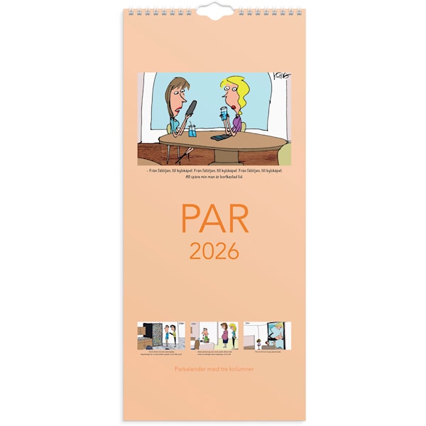Familjekalender 2026 från Burde. Liten smidig familjekalender för paret. Kom ihåg bio, restaurangbesök, spa och all annan viktig information för vardagspusslet. Familjekalender med 3 kolumner, illustrerad med humoristiska teckningar av Jerry King. Format: 190×430 mm. Layout: Månad/blad. Kalendarium: 2026-01-01 – 2026-12-31. Spiralbunden. Innehåll: Flaggdagar, helgdagar/aftnar, månfaser, namnsdagar, temadagar/händelser, 3 kolumner. Antal sidor: 12. Miljöinformation: FSC®. Legal manufacturer Name: Burde Publishing AB Legal manufacturer Adress: Box 3101, SE-350 43 VÄXJÖ Legal manufacturer website: www.burde.com Legal manufacturer e-mail: info@burde.com