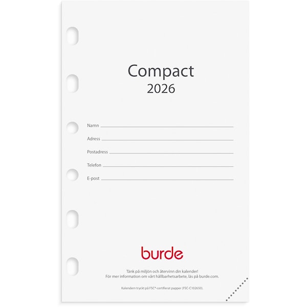 | Kalender 2026 från Burde. Hålad kalenderrefill till systemkalender med ringmekanism. Format: 79×127 mm. Layout: Vecka/uppslag. Liggande. Kalendarium: 2025-11-10 – 2027-01-24. Omslag: Kartong. Innehåll: Kyrkliga helgdagar, flaggdagar, helgdagar/aftnar, månfaser, namnsdagar, internationella helgdagar översikt, temadagar/händelser, årsöversikt/årsöversikter, årsplan/årsplaner. Antal sidor: 128. Miljöinformation: FSC®. Legal manufacturer Name: Burde Publishing AB Legal manufacturer Adress: Box 3101, SE-350 43 VÄXJÖ Legal manufacturer website: www.burde.com Legal manufacturer e-mail: info@burde.com |