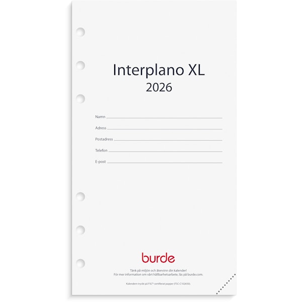 | Kalender 2026 från Burde. Hålad kalenderrefill till systemkalender med ringmekanism. Format: 95×170 mm. Layout: Vecka/uppslag. Stående. Timindelning 8-19. Kalendarium: 2025-12-22 – 2027-01-03. Omslag: Kartong. Innehåll: Kyrkliga helgdagar, flaggdagar, helgdagar/aftnar, månfaser, namnsdagar, internationella helgdagar översikt, temadagar/händelser, årsöversikt/årsöversikter, årsplan/årsplaner. Antal sidor: 128. Miljöinformation: FSC®. Legal manufacturer Name: Burde Publishing AB Legal manufacturer Adress: Box 3101, SE-350 43 VÄXJÖ Legal manufacturer website: www.burde.com Legal manufacturer e-mail: info@burde.com |