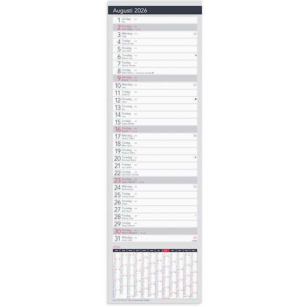 | Kalender 2026 från Burde. Format: 115×370 mm. Layout: Månad/blad. Kalendarium: 2026-01-01 – 2026-12-31. Limbunden. Innehåll: Kyrkliga helgdagar, flaggdagar, helgdagar/aftnar, månfaser, namnsdagar, temadagar/händelser, årsöversikt/årsöversikter. Antal sidor: 24. Miljöinformation: FSC®. Klimatkompenserad. Legal manufacturer Name: Burde Publishing AB Legal manufacturer Adress: Box 3101, SE-350 43 VÄXJÖ Legal manufacturer website: www.burde.com Legal manufacturer e-mail: info@burde.com |