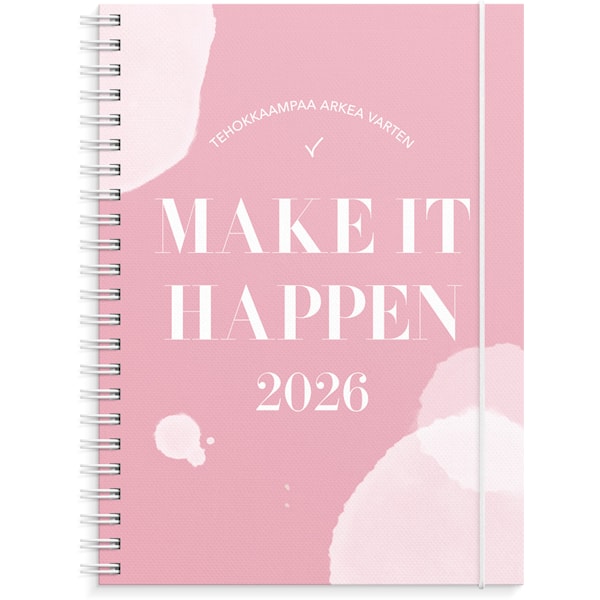 Kun sinulla tapahtuu paljon asioita samanaikaisesti, on helppo unohtaavosa niistä! Kalenteri Make It Happen, auttaa sinua järjestelemään arkeasi ja olemaan tehokas jokapäiväisessä elämässä niin, että sinun ei tarvitse muistaa kaikkea. Jokaisella aukeamalla löytyy listoja, joiden avulla voit suunnitella esimerkiksi ostoksesi, tapaamiset sekä hoidettavat asiat. Kartonkikansi, kuminauhalla. Paperitasku. Kalenterin aukeamalla yksi viikko ja muistilistat. Kalenteri sisältää nimipäivät, juhlapyhät, liputuspäivät, kuun vaiheet, vuosisuunnitelmat kuluvalle vuodelle ja seuraavalle vuodelle, yleiset pyhäpäivät maailmalla, kalendaariset tiedot, auringon nousu- ja laskuajat ja muistiinpanosivut. Kalenteriosa: vk 51 2025-vk 53 2026/2027. Suomenkielinen. Parikierresidottu. FSC®. Koko: 148×210 mm (A5). Legal manufacturer Name: Burde Publishing AB Legal manufacturer Adress: Box 3101, SE-350 43 VÄXJÖ Legal manufacturer website: www.burde.com Legal manufacturer e-mail: info@burde.com
