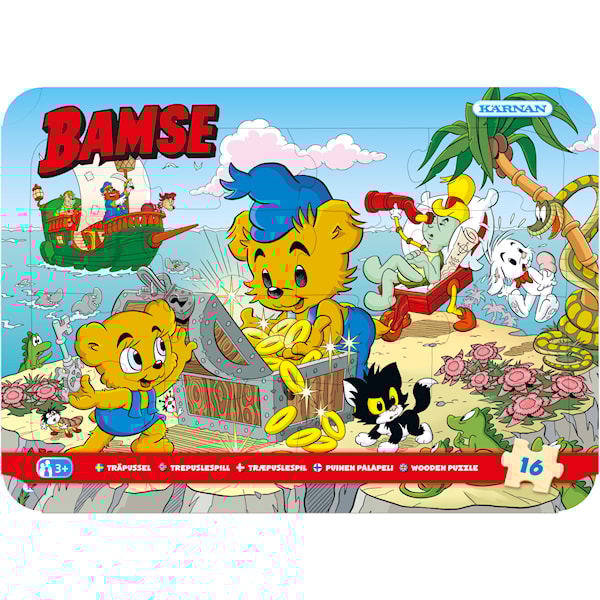 Kehyspalapeli, 16 palaa, puinen. Hauska Bamse-palapeli merirosvoteemalla. Legal manufacturer Name: Story House Egmont AB Legal manufacturer Adress: Studentgatan 4, 211 38 Malmö Legal manufacturer website: storyhouseegmont.se Legal manufacturer e-mail: orderkontor@egmont.se