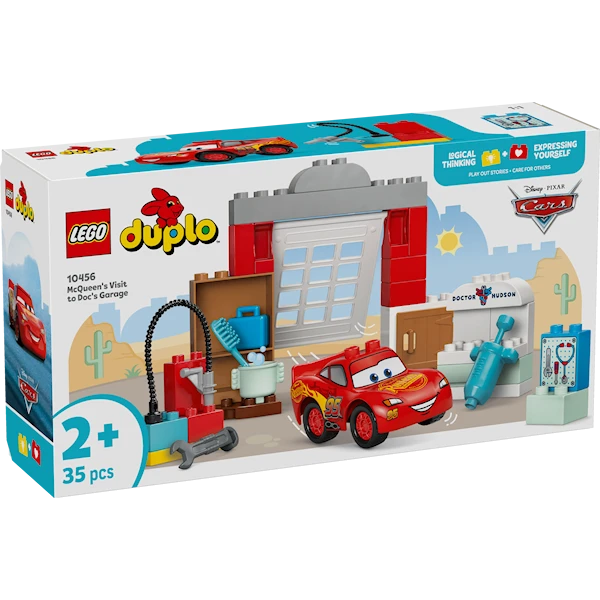 LEGO® DUPLO® │ Disney ja Pixar Autot – McQueenin vierailu Docin tallilla (10456) rakennuslelun inspiroimissa leikeissä alle kouluikäiset pitävät huolta suosikkikilpa-autostaan ja tuunaavat sen huippukuntoon. Rakennussetin seikkailuissa lapset suuntaavat Disneyn ja Pixarin Autot-elokuvista tuttuihin seikkailuihin ja luoviin leikkeihin. Ajoneuvoaiheisen rakennuslelun inspiroimat luovat leikit saavat lentävän lähdön Salama McQueenin kurvatessa renkaat vinkuen autotallin ovista. Lapsista on kiva ajaa auto tallin heiluriovesta sisään ja ulos. Hienomotoriset taidot kehittyvät, kun lapset leikkivät jakoavaimella, avaavat ja sulkevat kaappien ovia ja irrottavat letkun pestäkseen Salama McQueenin puhtaaksi kisapäivän pölyistä. LEGO® DUPLO® rakennuslelu innostaa taaperot mielikuvitusleikkeihin ja kehittää tärkeitä taitoja. Myös tunnetaidot kehittyvät, kun lapset ottavat vastuun kilpa-auton korjaamisesta ja tuunaamisesta huippukuntoon. Setissä on 35 osaa. Autot-elokuvan fanit voivat kurvata