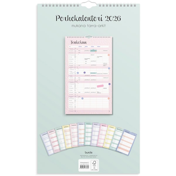 | 12 sivua. Seinäkalenteri, jossa jokaisella aukeamalla yksi kuukausi ja viisi saraketta. Sisältää neljä tarraarkkia. Kalenteri sisältää nimipäivät, juhlapyhät, liputuspäivät ja kuun vaiheet. Suomenkielinen. Parikierresidottu. FSC®. Koko: 250×420 mm. Legal manufacturer Name: Burde Publishing AB Legal manufacturer Adress: Box 3101, SE-350 43 VÄXJÖ Legal manufacturer website: www.burde.com Legal manufacturer e-mail: info@burde.com | ![]() |