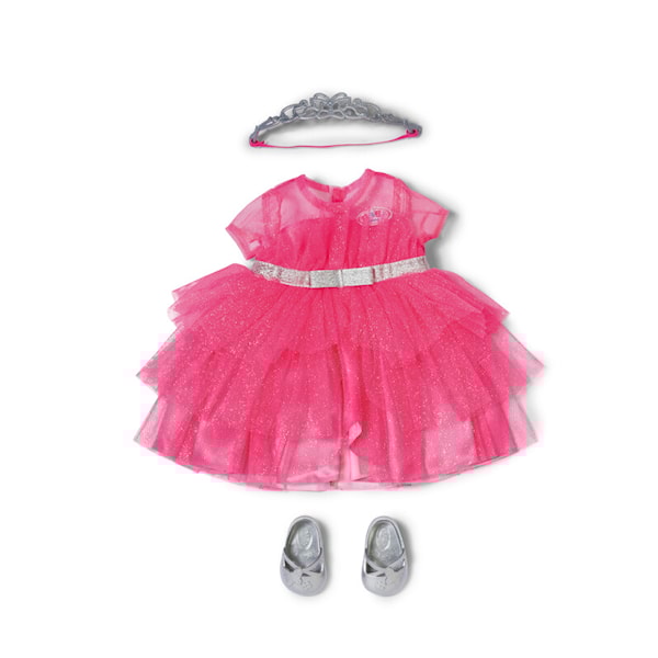 | Tämä on unelmien prinsessamekko. Vaaleanpunaista tylliä, hopeanvärinen vyö ja kimallusta kaikkialla. Asukokonaisuuden kruunaavat elegantit hopeakengät ja tietenkin tiara kuninkaallista ilmettä varten. Korkealaatuiset asusteet BABY born -nukelle. Tarjoaa mahdollisuuden entistä monipuolisempaan ja pitkäkestoisempaan leikkiin. Yli 3-vuotiaille. Sisältää: – BABY born prinsessa-asu, joka koostuu glittermekosta, vyöstä, pannan diadeemista ja kengistä. | ![]() |