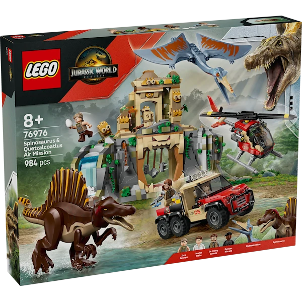 Lähde Zoran ja kumppaneiden mukaan muinaiseen temppeliin. Zora Bennett, Martin Krebs, tri Henry Loomis ja Duncan Kincaid keräävät DNA-näytteitä Quetzalcoatlusin pesästä. Raivaa tiesi vesiputouksen läpi ja kiipeä seinämää pitkin pesän luo. Ota dinosauruksenmunasta näyte, mutta toimi nopeasti. Onko tuo Quetzalcoatlus? Ei, vaan hurja Spinosaurus! Nyt helikopterin kyytiin ja äkkiä pakoon! Interaktiivinen LEGO® Jurassic World Spinosauruksen ja Quetzalcoatlusin pako lentäen (76976) rakennussetti innostaa yli 8-vuotiaat lapset ja fanit dinoseikkailuihin. Elokuvan inspiroima dinoaiheinen lahja sopii sekä tytöille että pojille. Setti sisältää 2 Jurassic World: Rebirth ‑elokuvasta tuttua, ruiskuvalettua dinohahmoa. Mukana on myös 4 minihahmoa elokuvasta: Martin Krebs, Zora Bennett, Duncan Kincaid ja tri Henry Loomis. Spinosaurus-hahmon pään, pyrstön, leuat, kädet ja jalat voi asetella eri asentoihin, ja Quetzalcoatlus-hahmon siipiä ja leukoja voi liikuttaa. Mukana on myös muinaista temppeliä ja