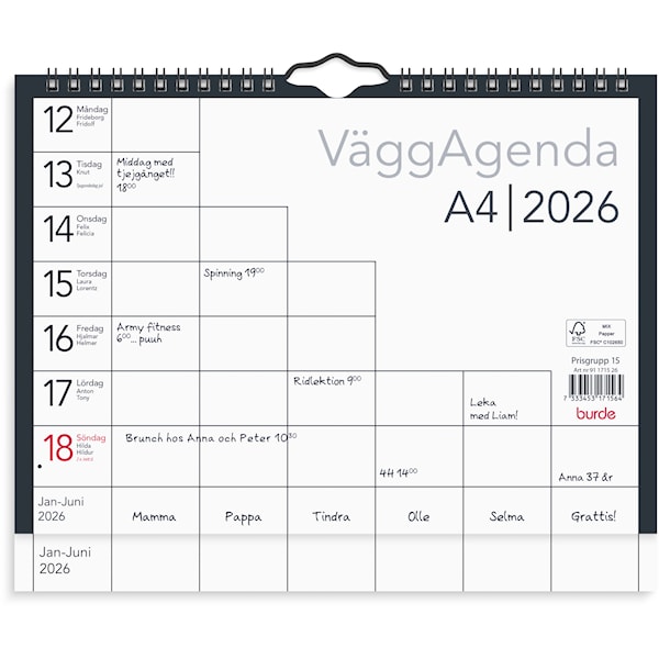 | Väggkalender 2026 från Burde. Format: A4. Layout: Vecka/blad. Kalendarium: 2025-12-29 – 2027-01-03. Spiralbunden. Innehåll: Kyrkliga helgdagar, flaggdagar, helgdagar/aftnar, månfaser, namnsdagar, temadagar/händelser, årsplan/årsplaner, 6 kolumner. Antal sidor: 52. Miljöinformation: FSC®. Legal manufacturer Name: Burde Publishing AB Legal manufacturer Adress: Box 3101, SE-350 43 VÄXJÖ Legal manufacturer website: www.burde.com Legal manufacturer e-mail: info@burde.com | ![]() |