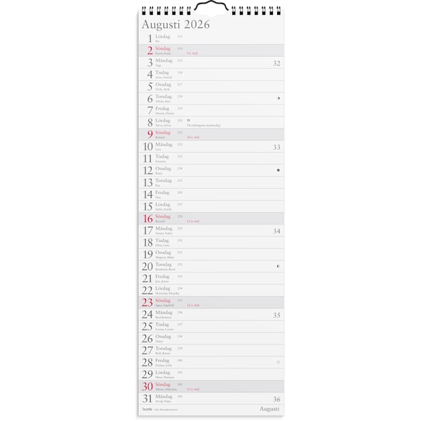 Väggkalender 2026 från Burde. Format: 175×490 mm. Layout: Månad/blad. Kalendarium: 2026-01-01 – 2026-12-31. Spiralbunden. Innehåll: Kyrkliga helgdagar, flaggdagar, helgdagar/aftnar, månfaser, namnsdagar, temadagar/händelser. Antal sidor: 12. Miljöinformation: FSC®. Legal manufacturer Name: Burde Publishing AB Legal manufacturer Adress: Box 3101, SE-350 43 VÄXJÖ Legal manufacturer website: www.burde.com Legal manufacturer e-mail: info@burde.com