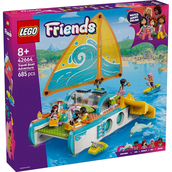 Tässä hauska rakennussarja lahjaksi ilahduttamaan pieniä merenkävijöitä! LEGO® Friends Veneseikkailu (42664) yli 8-vuotiaille tytöille ja pojille sisältää 4 LEGO Friends mininukkea ja runsaasti tarvikkeita mielikuvitusleikkeihin. Yksityiskohtainen vene on täynnä realistisia ominaisuuksia, kuten ruorilla kääntyvä purje! Lapset kertovat tarinoita veneseikkailulle lähteneistä Paisleysta, Zacista, Celinestä ja Skysta. Veneessä on tilaa ruoanlaittoon, ruokailuun, rentoutumiseen ja nukkumiseen, joten se innostaa keksimään uusia tarinoita jokaisella leikkikerralla. Tutustu porealtaaseen, jossa on kelluke, sekä pelialueeseen, 4 vuodetta sisältävään makuutilaan, suihkuun ja vessaan. Irrota veneen katto päästäksesi käsiksi yksityiskohtaiseen keittokomeroon ja ruokailutilaan. Lapsille riittää tutkittavaa, kun he vievät hahmonsa laittamaan ruokaa ja syömään. Loma-aiheisina tarvikkeina kiikarit delfiinin ja sen poikasen seuraamiseen, 2 vesiskootteria, surffilauta, räpylät, peliohjaimet ja paljon