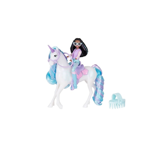 Unicorn Academyn Layla & Glacier -leikkisetti juhlistaa ratsastajan ja yksisarvisen välistä vahvaa sidettä. Laylassa (11,4 cm) on 7 liikkuvaa niveltä ja realistisia yksityiskohtia sarjasta. Glacier (12,7 cm) sopii Laylan tyyliin jäätaikoilla ja sinisellä, valkoisella ja vaaleanpunaisella harjattavalla harjalla ja häntällä (harja mukana). Irrotettavan suitsien ja satulan ansiosta Layla istuu helposti Glacierilla heidän ajaessaan uusia seikkailuja. Unicorn Academyn hahmot heräävät henkiin animoidun NETFLIX-sarjan ja myydyimpien kirjojen innoittamana, jossa ystävyys hallitsee. 4-vuotiaasta alkaen.