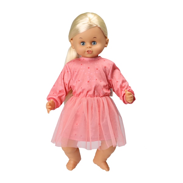 Mielikuvitukselliset nukkeleikit ovat aina lähellä Skrållanin kanssa! Hänellä on yllään kuviollinen, vaaleanpunainen mekko, jossa on tyllihame. Hänen pitkä, pehmeä hiuksensa on sidottu poninhännälle ja se on helppo harjata ja letittää. Nukke on 45 cm pitkä ja puhuu viittä eri kieltä: ruotsi, norja, tanska, suomi ja englanti. Vaihda helposti kieltä nuken selässä olevasta puhemekanismista. Paina vatsaa, niin puhuva nukke sanoo 24 satunnaisesti valittua lausetta, jotka rohkaisevat aktiiviseen leikkiin – ulkona ja sisällä! Nuken vartalo on pehmeä, ja silmät sulkeutuvat, kun lapsi asettaa hänet makuulle. Yhdistä ja yhdistele mielellään nukketarvikkeita ja nukenvaatteita, jotka sopivat jopa 45 cm nukeille. Skrållan – Ruotsalainen klassikko vuodesta 1966, joka on rakastettu sukupolvien ajan. Laadukkaita nukkeja, nukkien tarvikkeita ja nukkien vaatteita, jotka tuottavat iloa ja hauskaa nukkeleikkeihin lapsille kaikissa ikäryhmissä! Varoitus! Ei sovellu alle 36 kuukauden ikäisille lapsille.