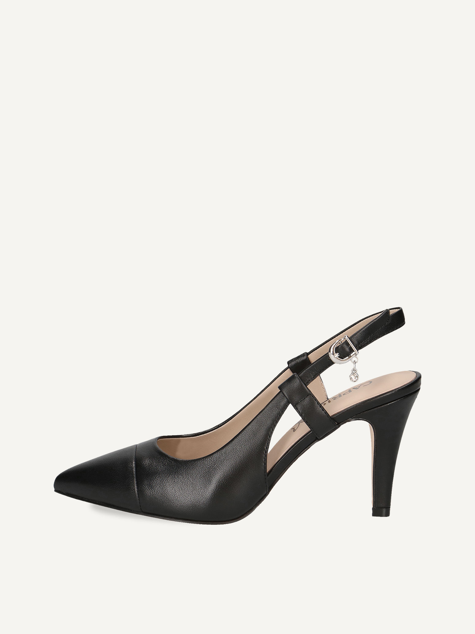 | You’ll love the elegant collection of Caprice women’s sling pumps. With a heel height of 8.5 cm and a shaft height of 6 cm, they offer optimal comfort. The G-width ensures a perfect fit. The leather upper and funnel heel give you a stylish look. The tapered toe and the closure with clasp complete the design. Thanks to CAP Memotion technology, you can enjoy a pleasant running experience. | ![]() |
